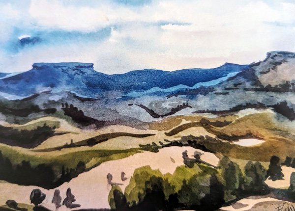 This Watercolour sketch of Ourangi and Pukeokahu was painted from the road to Pukeokahu and is a much loved view from my childhood.